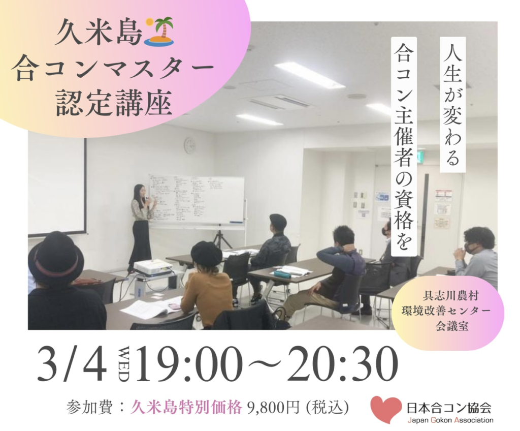 沖縄・久米島近辺で合コンマスターの資格を取得したい方、ぜひこの貴重な機会にご参加ください。